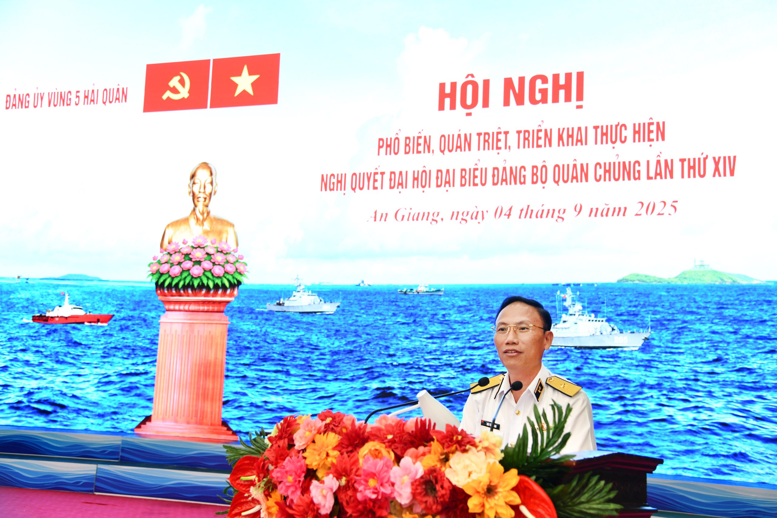 Tạp chí Biển Việt Nam - Sáng 4/9, tại Đặc khu Phú Quốc, tỉnh An Giang, Thường vụ Đảng ủy Vùng 5 Hải quân tổ chức Hội nghị phổ biến, quán triệt, triển khai thực hiện Nghị quyết Đại hội đại biểu Đảng bộ Quân chủng Hải quân lần thứ XIV. Chuẩn Đô đốc Ngô Văn Thành, Bí thư Đảng ủy, Chính ủy Vùng trực tiếp truyền đạt